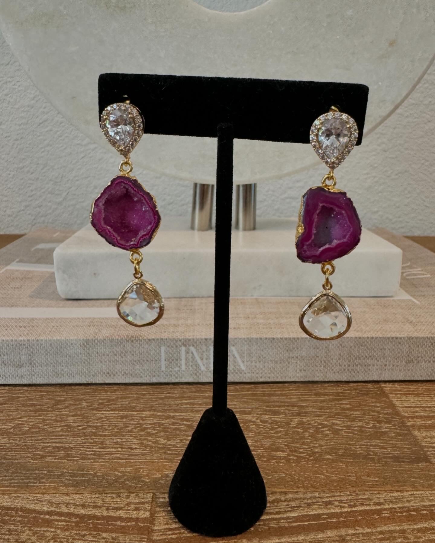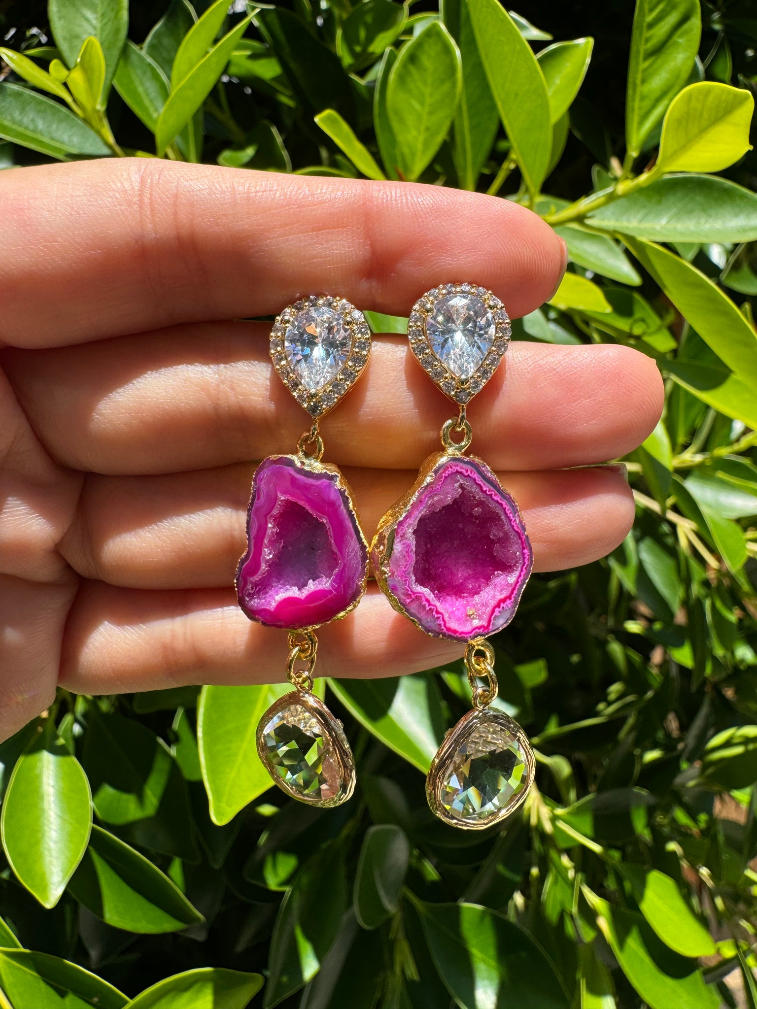 Cz top with pink geode center and a crystal bottom. 2 inch drop.